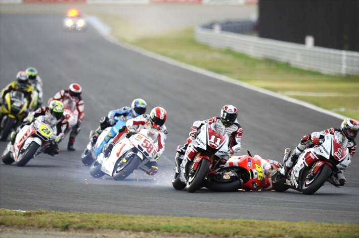 Sporna i „radioaktivna“ utrka u Motegiju ne samo da je na kraju održana, nego je i bila jedna od najluđih ove sezone. Zanimljivo je postalo već i prije nego se upalilo zeleno svjetlo na semaforu, budući je Dovizioso prerano startao i za sobom povukao i Simoncellija, a tankih je živaca bio i Crutchlow. Zatim su se već u drugom zavoju dodirnuli Rossi i Lorenzo, nakon čega je Rossi pao i pritom u pijesak izgurao nedužnog Spiesa, koji je ipak uspio nastaviti utrku. Taman kada se činilo da su stvari krenule ove godine uobičajenim tijekom u kojem Stoner vodi od početka do kraja, došao je 5. krug u kojem se pri kraju duge ravnice Australčeva Honda toliko snažno protresla da su se pomakle kočione pločice.