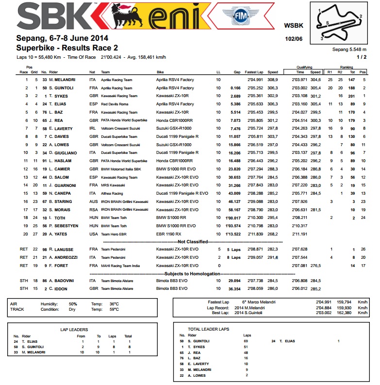 Sepang (Malezija), 8. lipnja 2014. – Ovo kolo svjetskog Superbike prvenstva, koje je po prvi put održano na stazi u Sepangu, bilo je u znaku Aprilije koja je dominirala u obje utrke. Dvostruka pobjeda Marca Melandija i dvostruko osvajanje drugog mjesta Sylvaina Guintolija potvrdili su nadmoć koju je tijekom treninga na Malezijskoj stazi pokazala Aprilia RSV4, uključujući i Apriliju Tonia Eliasa koji ne vozi za Aprilijin tvornički tim.