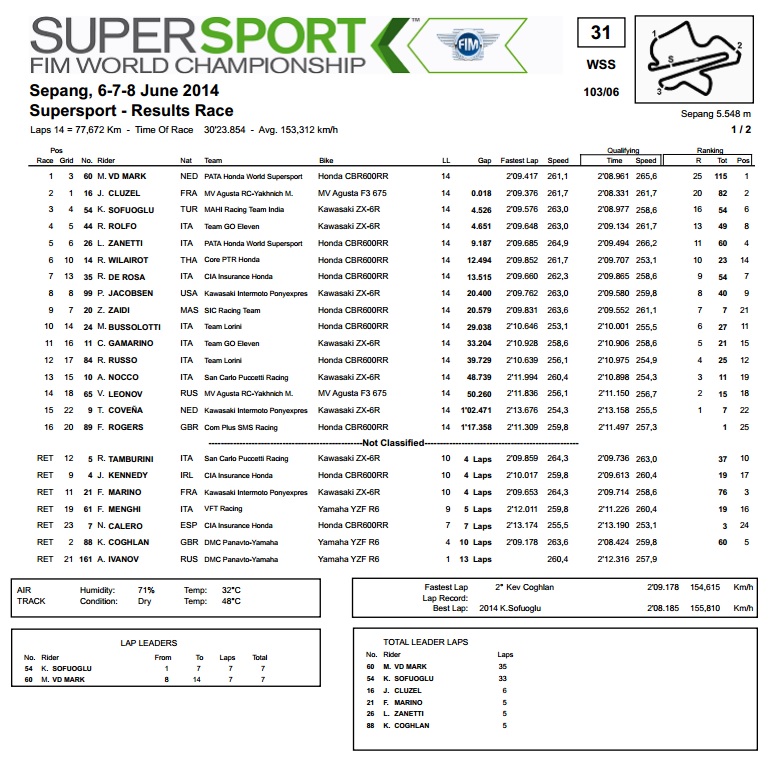 Iznimno neizvjesna Supersport utrka odlučila se tek u posljednjem zavoju nakon kojeg je VD Mark na Hondi prošao ciljem samo 18 tisućinki prije Cluzela na MV Agusti. Time su se njih dvojica učvrstili i na prvoj i drugoj poziciji u ukupnom poretku, dok je treće mjesto u utrci, ali i tek 6. u ukupnom poretku, zauzeo Sofuoglu koji je bio za desetinku brži od Rolfa na drugom Kawasakiju.
