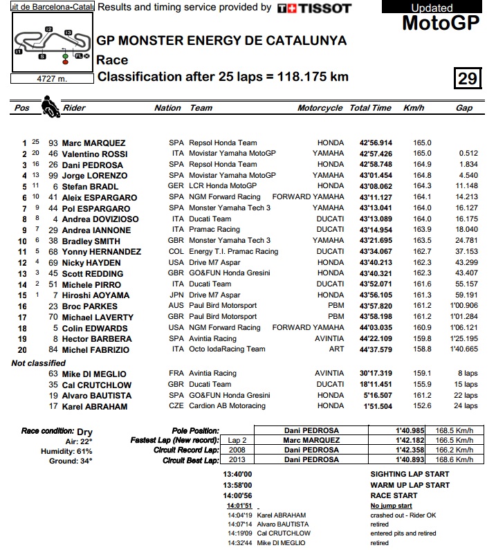 Iako je i prošli put u Mugellu bilo jako zanimljivo, utrka u Barceloni je bila jedna od boljih u živom sjećanju. Sa starta je najbolje krenuo Lorenzo i poveo utrku, no relativno brzo je potonuo na 4. mjesto, gdje je ostao do kraja, pokušavajući održati kontakt s prvom trojicom.