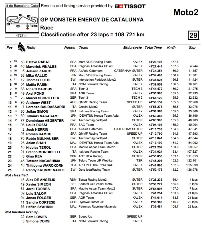 Moto2 utrka je ponovo pokazala da je riječ o kontaktnom sportu, tako da sudara i padova nije nedostajalo. Ipak, Tito Rabat u toj borbi nije bio ni okrznut i uvjerljivo je slavio svoju četvrtu ovogodišnju pobjedu, s velikih 4,2 sekunde prednosti nad Maverickom Vinalesom, dok je u borbi za treće mjesto Zarco bio spretniji od Kallia i Luthija te je tako donio prvi podij momčadi Caterham.
