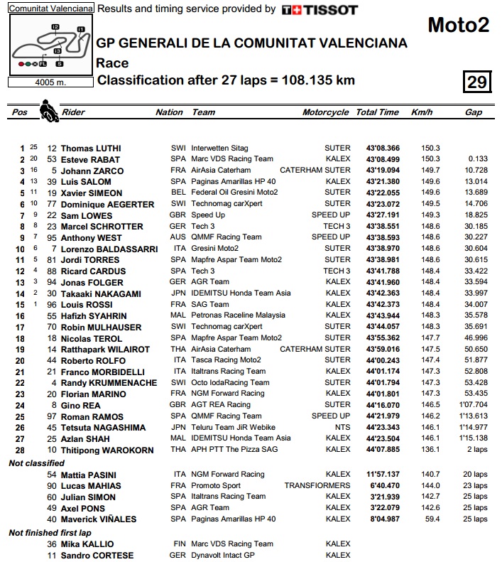 Start utrke u klasi Moto2 obilježilo je zalijetanje odlazećeg Mavericka Vinalesa u viceprvaka Kallia, nakon čega su obojica ispali iz igre. To je trebalo olakšati put do pobjede novom prvaku Rabatu, no njega je poput sjene pratio Luthi. Ta mu se upornost isplatila na samom kraju posljednjeg kruga, kada je Rabatovom motocikl na tren ostao bez benzina i taman toliko posustao da Luthi projuri pored njega i odnese pobjedu. Treće mjesto je osvojio Zarco u onome što bi trebala biti posljednja utrka za momčad Caterham, barem pod tim imenom.