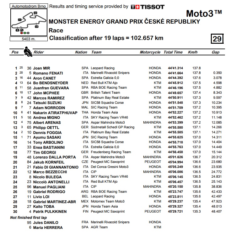 Vratimo li pozornost natrag na samu utrku u Brnu, onda treba spomenuti da su se iza sedmoplasiranog Petruccija za 8. mjesto borili Aleix i Pol Espargaro. Aleix je pritom trebao propustiti trojicu vozača ispred sebe, kao kaznu za to što se njegova Aprilija na izlasku iz boksa prepriječila Iannoneu koji je pritom naglo zakočio i pao, dok je mlađi brat Pol Espargaro osvajanjem 9. mjesta po prvi put doveo KTM među prvu desetoricu, koju je ovaj put zaključio Folger na Tech 3 Yamahi.