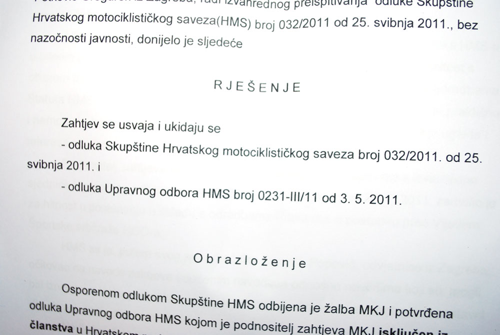 Vijeće sportske abitraže Hrvatskog olimpijskog odbora, krovnog tijela hrvatskog sporta, 28. srpnja 2011. godine donijelo je Rješenje kojim se ukidaju odluke Skupštine Hrvatskog motociklističkog saveza, od 25. svibnja i Upravnog odbora HMS-a od 3. svibnja ove godine, o isključenju iz članstva u HMS-u Motokros kluba Jaska!