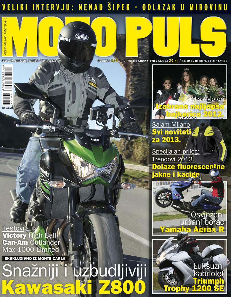 133. broj Moto Pulsa donosi testove vrućih noviteta za 2013., među kojima je svakako najzanimljiviji test Kawasakija Z800, no ispipali smo i potpuno novi Triumph Trophy 1200 SE, obnovljenu Yamahu Aerox R i luksuzni Can-Am Outlander Max 1000 Limited.