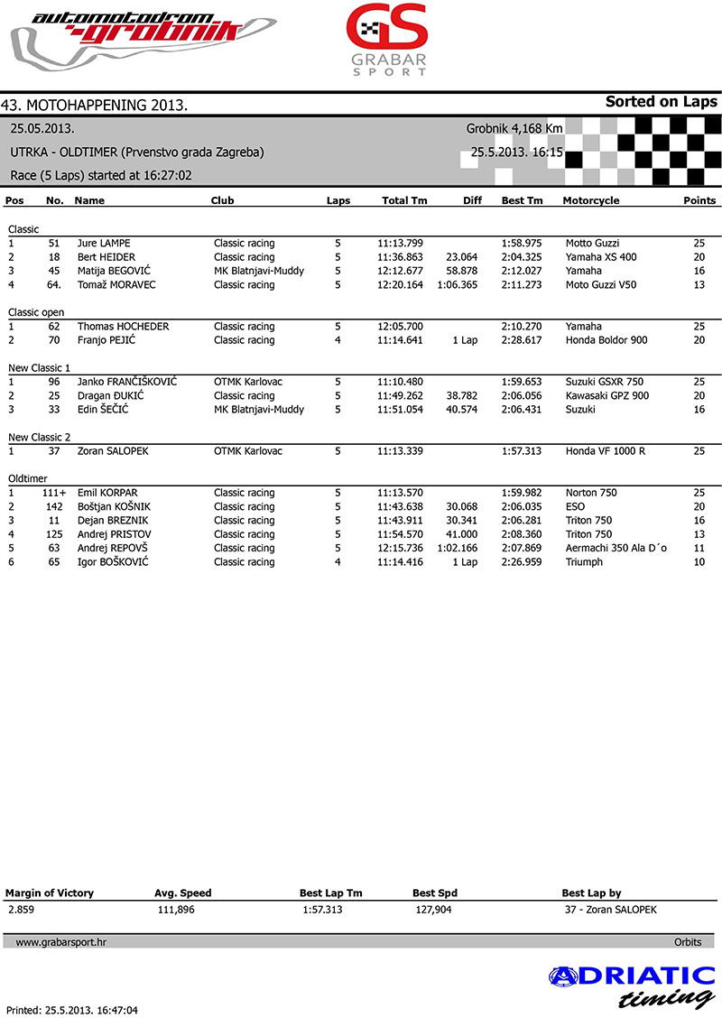 Poznati su rezultati 43. Motohappeninga na Grobniku u klasama Serija, Proserija, No Limit, Naked, BOT, Oldtimeri i Classic.